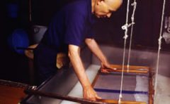 初代岩野平三郎の技法を受け継ぎ、画紙抄造に勉め、近代日本画家の皆様にご愛用いただいております。また、越前和紙古来の紙漉き模様「打雲・飛雲・水玉」の技法を継承し、県無形文化財に指定されました。